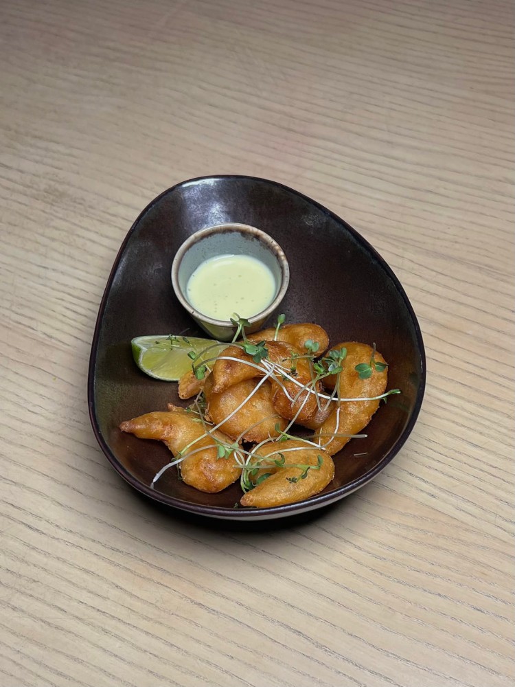 тигрові креветки, кляр темпура, італійські трави, фірмовий соус. (150/50гр)